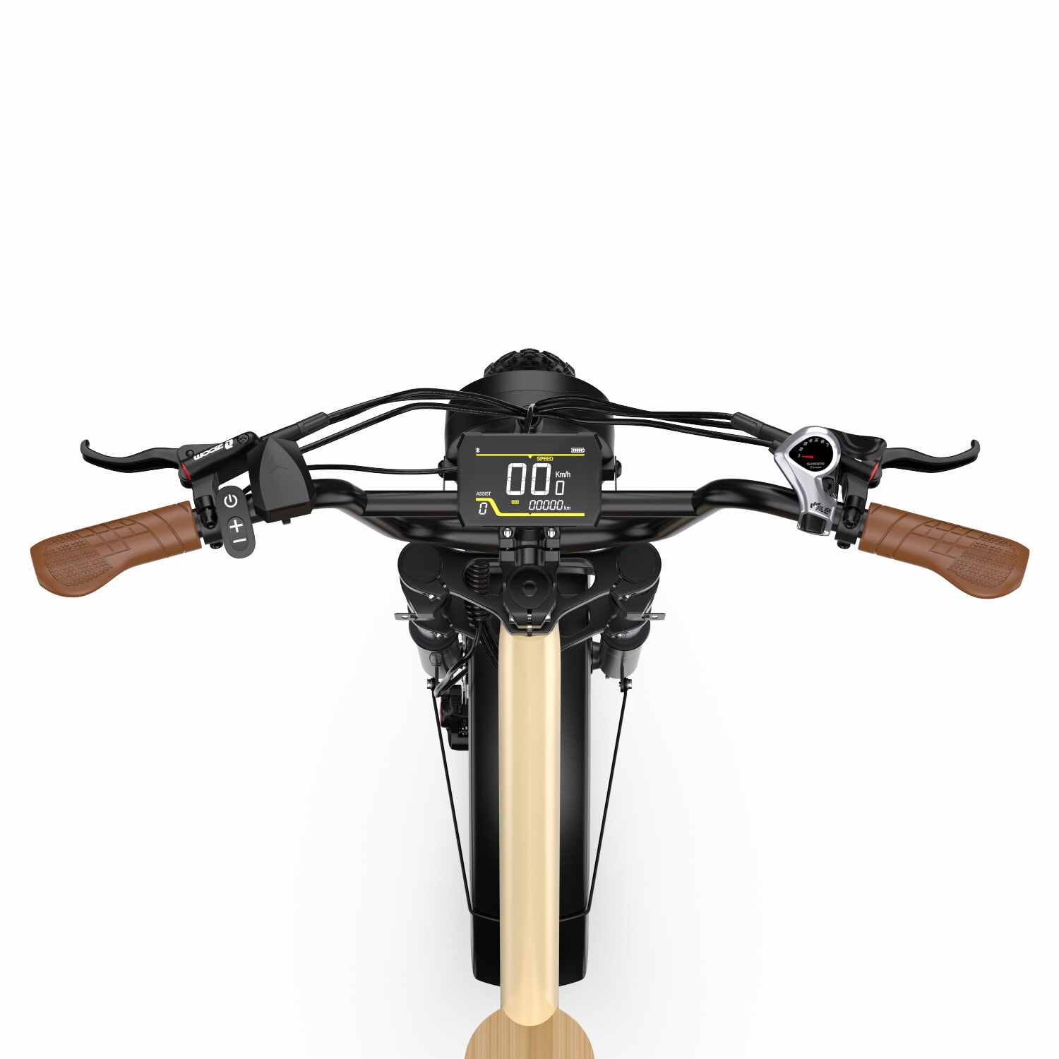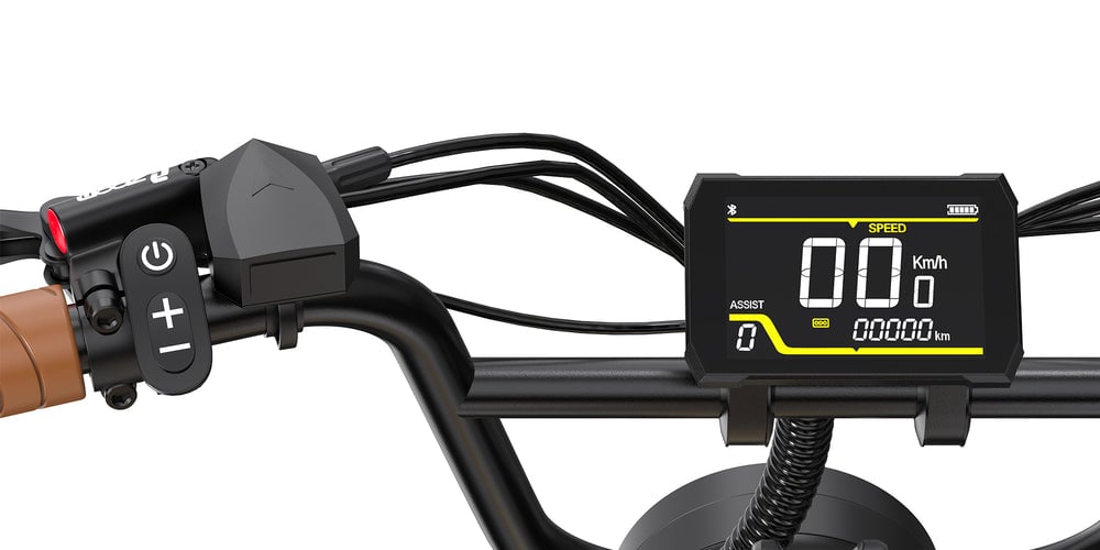 Large digital color screen with detailed analysis of all of indications, speed, battery level, with choice of adjustment between 3 levels of assistance, with bluetooth and USB charging port